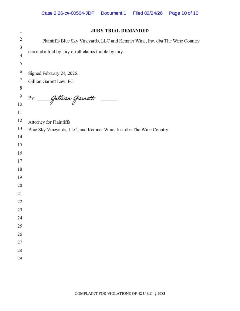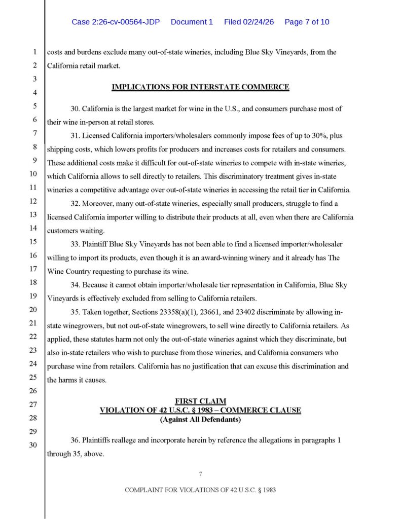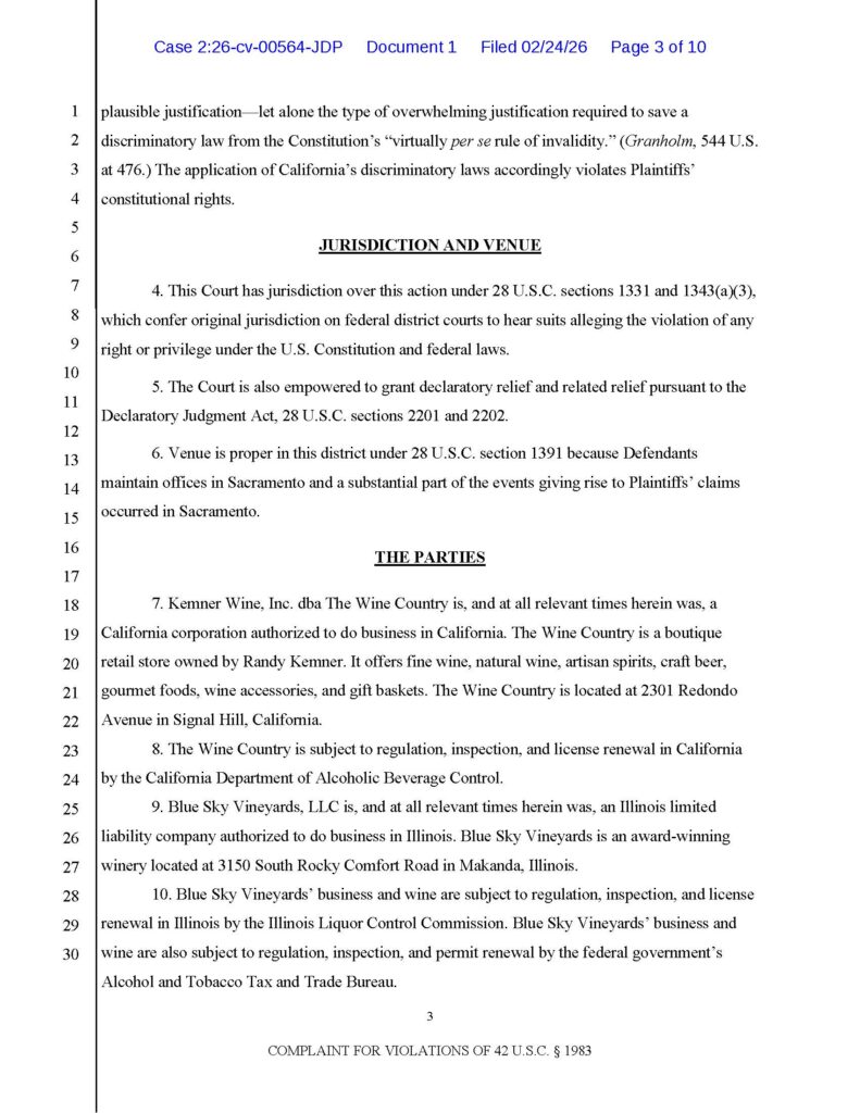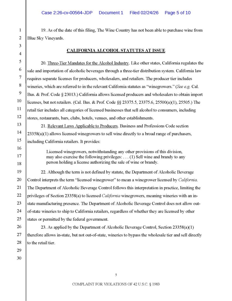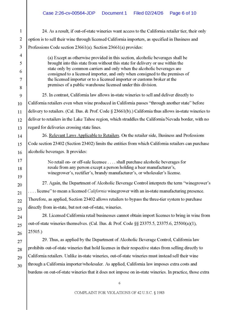I filed a lawsuit today against the State of California under Section 1983 for laws that violate the Commerce Clause and the Privileges and Immunities Clause. Joining me in this lawsuit is premier California alcohol law attorney Gillian Garrett of Gillian Garrett Law, PC.